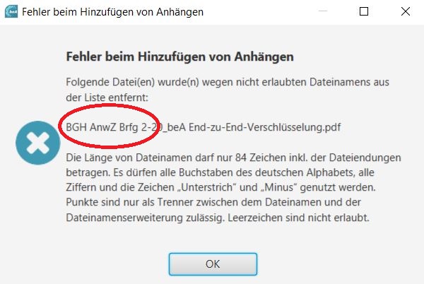 In der Vergangenheit hat die Verwendung von Zeichen in Dateinamen zum Teil dazu geführt, dass die Nachrichten von Rechtsanwältinnen und Rechtsanwälten von den Systemen der Justiz ausgefiltert und nicht weiterverarbeitet wurden. Im schlechtesten Fall hat der/die Rechtsanwalt/Rechtsanwältin hiervon nicht einmal etwas erfahren. Die BRAK hat sich daher dafür entschieden, zum Schutz der Rechtsanwältinnen und Rechtsanwälte in die neue beA-Version die Prüfung einzubauen, ob ein Anhangsname verwendet wird, der den Anforderungen der Justiz entspricht. Sollte dies nicht so sein, erhalten Sie die Warnmitteilung und können den Dateinamen entsprechend ändern. Dass dies unbequem ist, ist der BRAK selbstverständlich bewusst. Gleichwohl ist es die bessere Lösung, die Kolleginnen und Kollegen zu warnen, dass möglicherweise Probleme bei der Weiterverarbeitung der Nachricht durch die Justiz und den dort eingesetzten Fachanwendungen entstehen könnten.